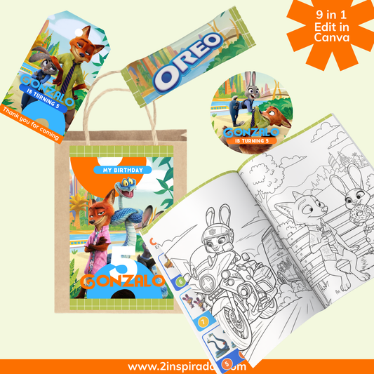 Kit cumpleaños de Zootopia editable en Canva