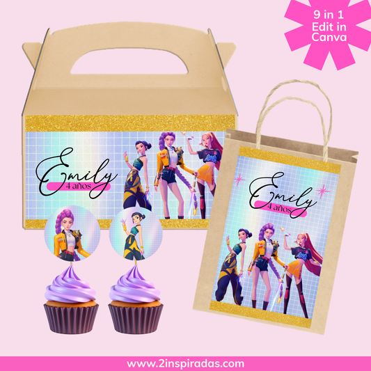 Kit cumpleaños de Kpop Demon Hunters editable en Canva